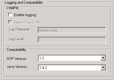 The Logging and Compatibility menu allows users to set logging information, and also specify the Java and CORBA versions