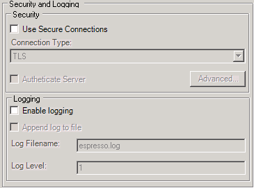 The security and logging menu allows users to specify configuration details for using TLS or SSL encryption via Espresso, and